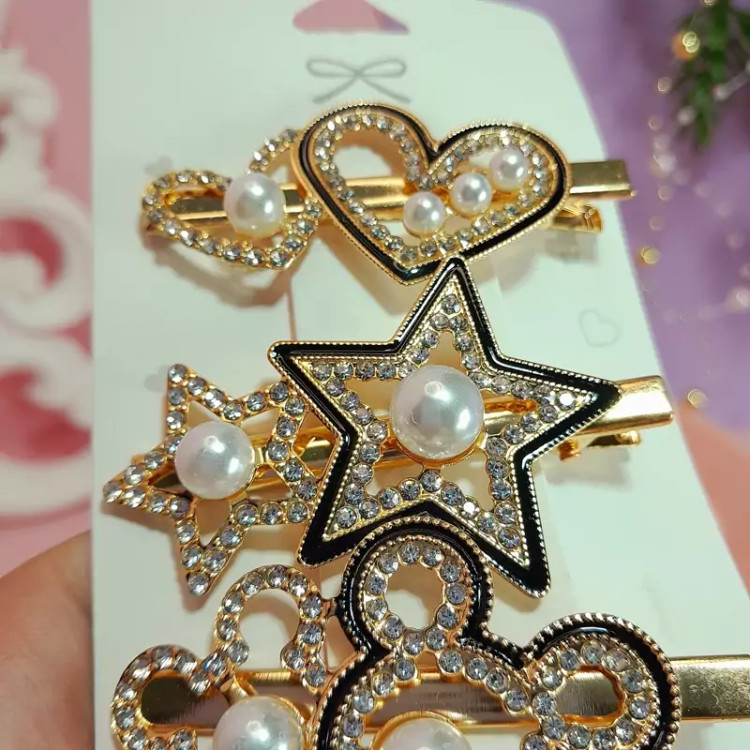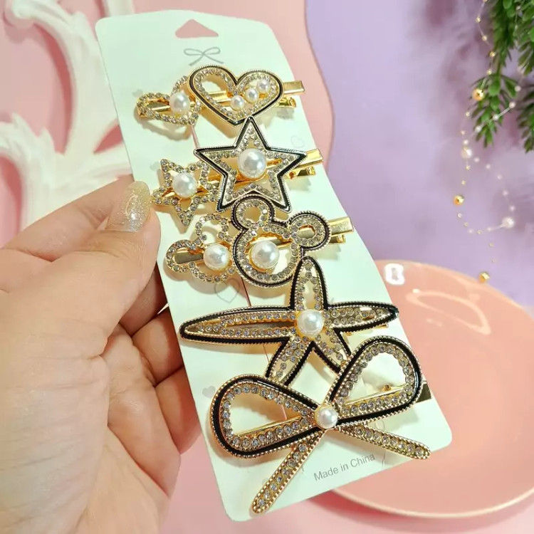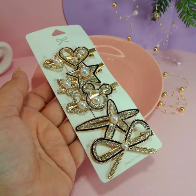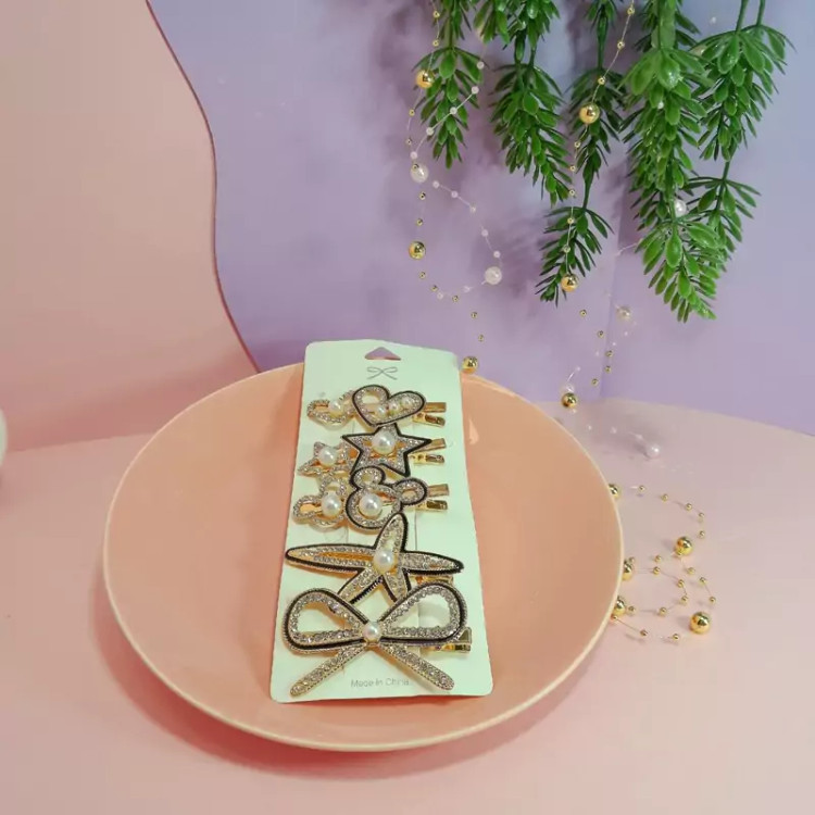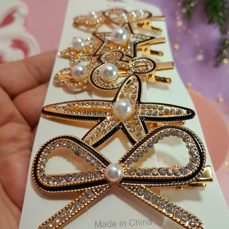 گیره موی مجلسی زنانه 5تایی طلایی مشکی با نگین های زیبا در 5طرح مختلف و جذاب درخشش دار گیره انبری6سانتی