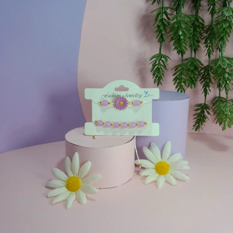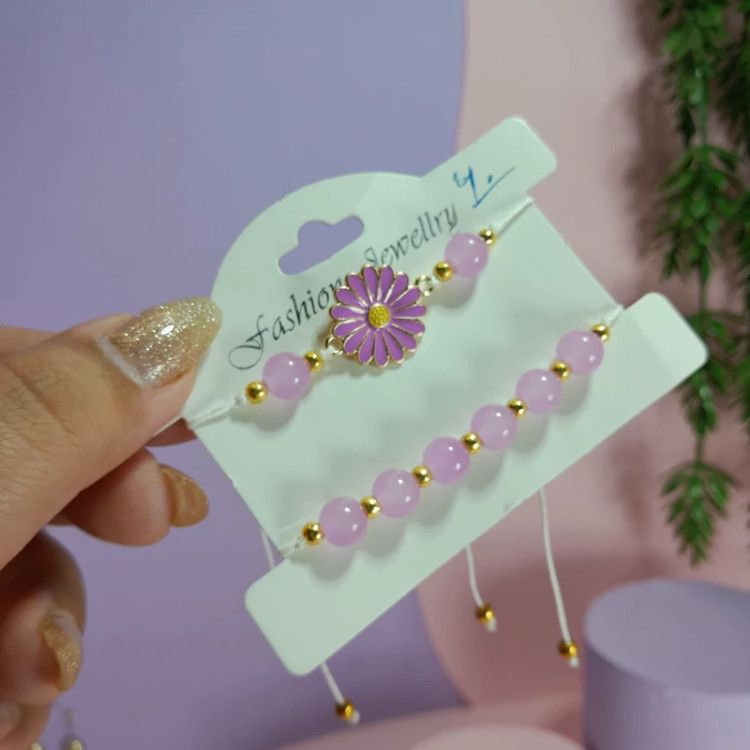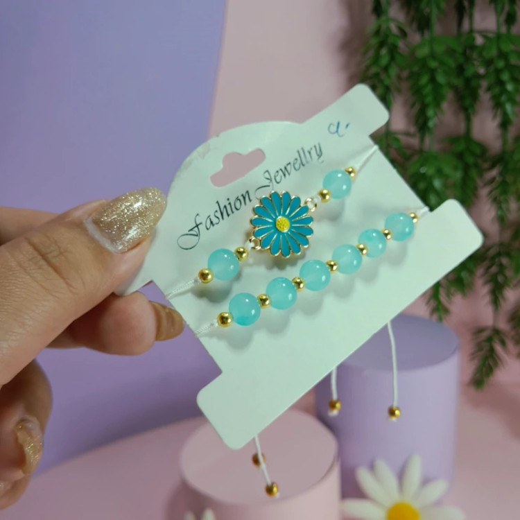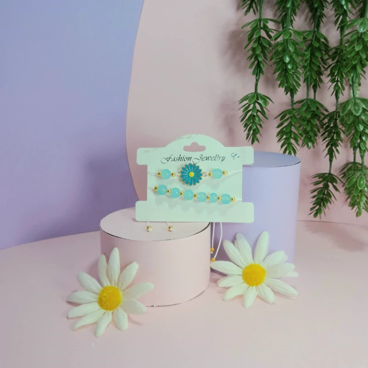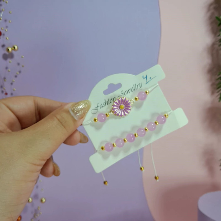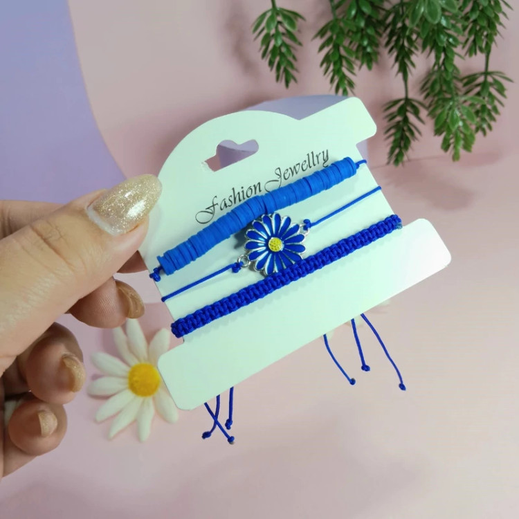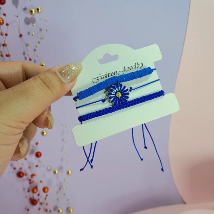 دستبند کشویی گل بابونه رنگ صورتی و رنگ آبی روشن دوتایی هستن یک ردیف مرواریدی و یک لاین بابونه و مروارید و رنگ آبی کاربنی سه لاین هست یک ردیف فیمو یک ردیف بافت و یک ردیف گل تکی بابونه است