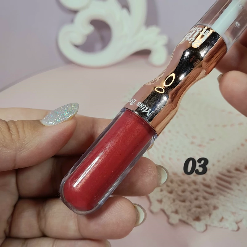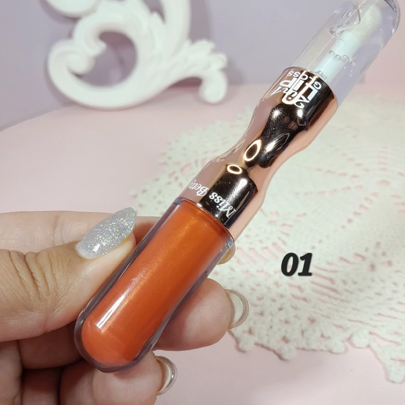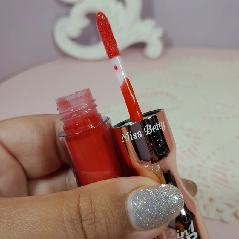 یک طرفش بی رنگه و برق لب یک طرفش رژمایع کمی براق ولی بسیارخوشرنگ ودلبر حالت پاستیلی و جذاب روی لب داره چسبندگی نداره کیفیتش خیلی خوبه خیلی هم کیوت و بامزه اس روی لب رنگ حرارتی همه صورتی نچرال میشه