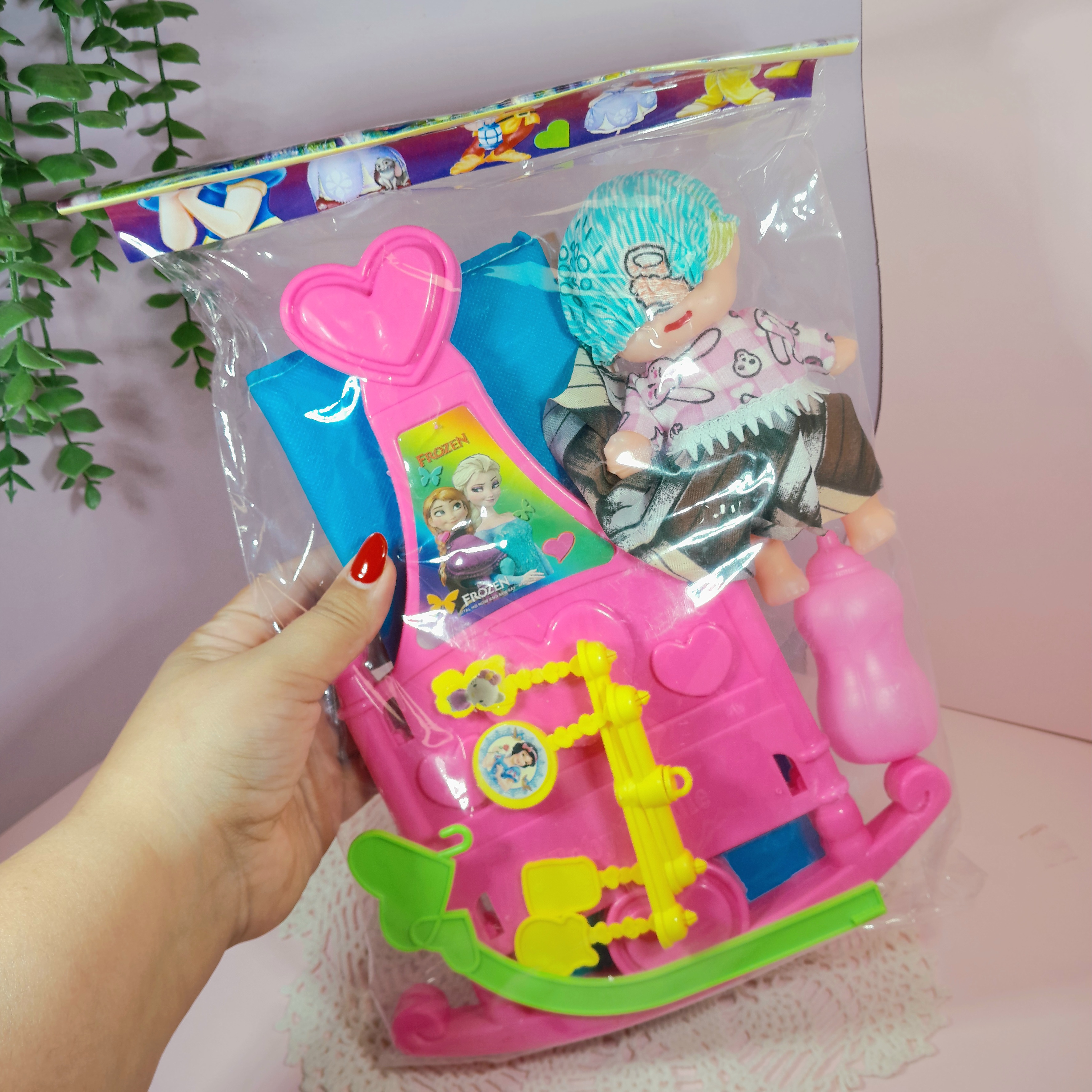 تختخواب گهواره ای اسباب بازی همراه با عروسک و آویز تخت و تشک و شیشه شیر